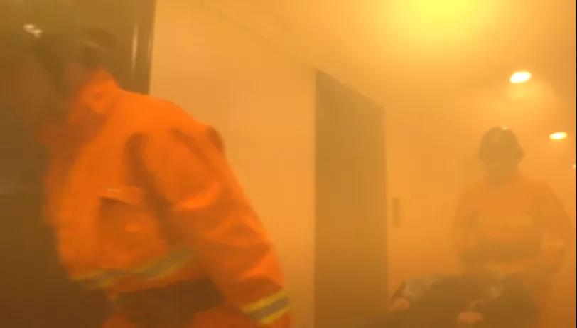 模拟火灾发生,酒店消防自动报警系统启动,迅速疏散人员到安全避难场所,火情得到有效控制;