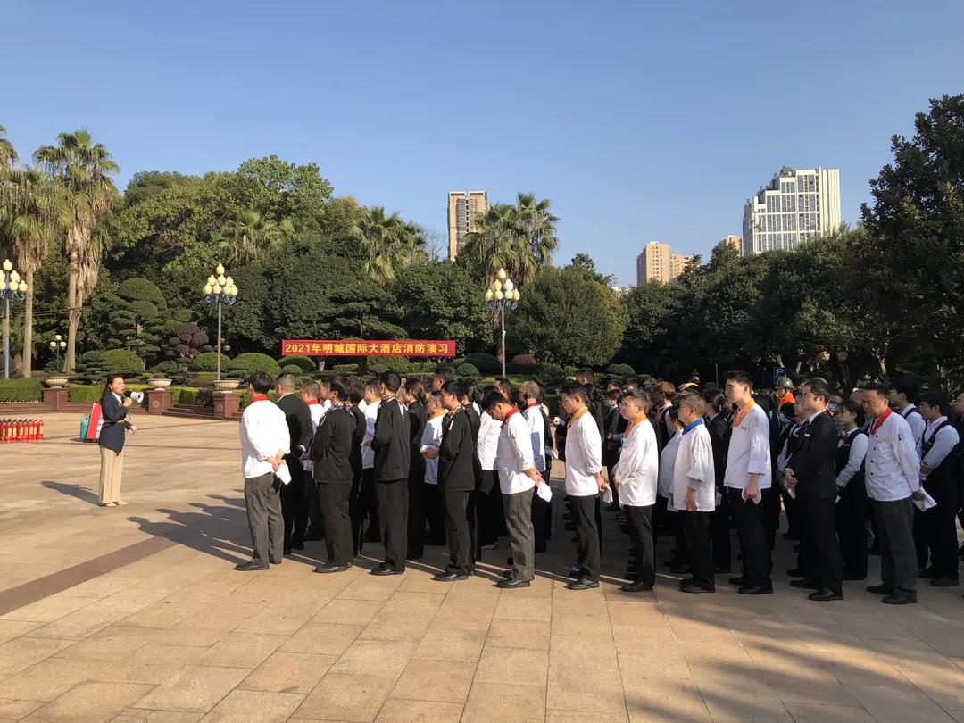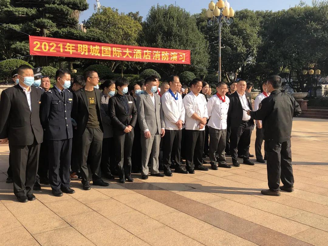 为了增强员工消防安全意识,了解火灾疏散和人员自救方法,从而提高酒店员工的防火、救火、救护、疏散等协同作战能力,2021年11月30日明城国际大酒店组织员工开展了年度消防疏散演习。