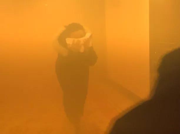 火灾逃生体验屋内放置烟雾,模拟火灾发生后身处无光亮且有浓烟环境下从弯曲过道逃生体验。