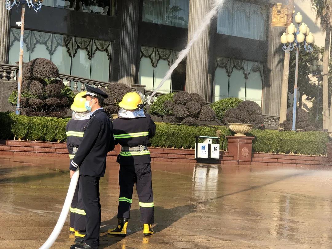 实战灭火阶段,酒店微型消防站演示室外消火栓水带出水和灭火器扑灭初期火势环节,各部门员工进行实战灭火演习。