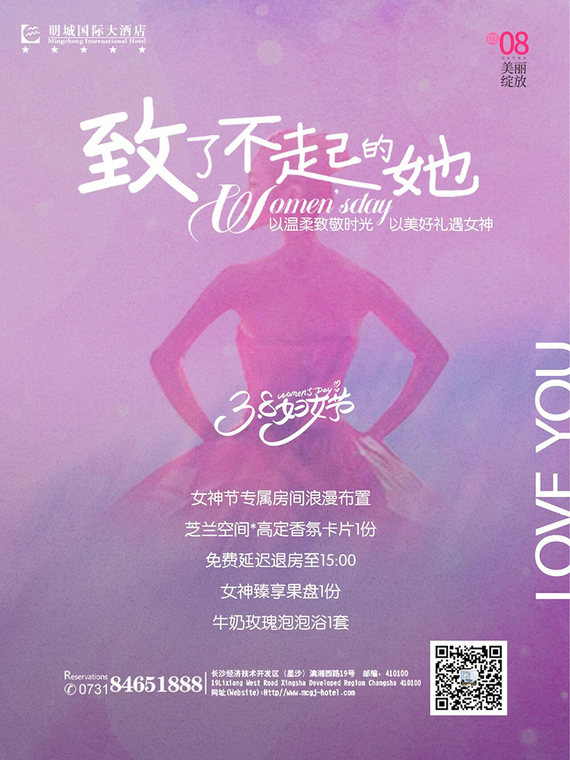 女神节专属礼遇房间浪漫布置芝兰空间*高定香氛卡片1份免费延迟退房至15:00女神臻享果盘1份牛奶玫瑰泡泡浴1套预约电话0731-84651888